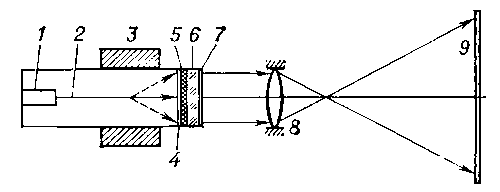 Рис. 3. Схема телевизионного проекционного устройства на электроннолучевой трубке с полупроводниковой лазерной мишенью: 1 — электронная пушка; 2 — электронный луч; 3 — отклоняющая система; 4 — зеркало оптического резонатора лазера, полностью отражающее свет; 5 — монокристаллическая пленка полупроводника; 6 — прозрачная подложка из сапфира; 7 — зеркало оптического резонатора, частично пропускающее свет; 8 — проекционный объектив; 9 — светорассеивающий экран.