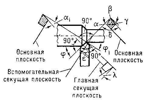 Элементы режущей части резца подразделяют на статические, определяющие углы заточки инструмента, и кинематические, зависящие от характера процесса резания и от установки резца. Углы заточки определяют форму режущей части при проектировании, изготовлении и контроле резца. Режущая часть резца имеет форму клина, заточенного под определёнными углами. Для определения углов установлены следующие координатные плоскости: плоскость резания и основная плоскость. Плоскость резания — это плоскость, касательная к поверхности резания и проходящая через главную режущую кромку. Основная плоскость — плоскость, параллельная продольной (параллельной оси заготовки) и поперечной (перпендикулярной оси заготовки) подачам резца. Эти координатные плоскости взаимно перпендикулярны. Главные углы резца определяются в главной секущей плоскости, перпендикулярной проекции главной режущей кромки на основную плоскость (рис. 2). Главный задний угол a — угол между главной задней поверхностью резца и плоскостью резания. При выборе заднего угла, во избежание трения задней поверхности резца об обрабатываемую поверхность и поверхность резания, учитывают величину подачи: чем она больше, тем больше задний угол. Угол заострения b — угол между передней и главной задней поверхностями резца. Главный передний угол g — угол между передней поверхностью резца и плоскостью, перпендикулярной плоскости резания. Выбор переднего угла зависит прежде всего от физико-механических свойств обрабатываемого материала. Чем больше передний угол, тем легче процесс образования стружки, тем меньше усилие резания и затрачиваемая мощность. Чем выше твёрдость обрабатываемого материала, тем меньшие значения передних углов резца принимают для его обработки. Угол резания d — угол между передней поверхностью резца и плоскостью резания. Главный угол в плане j— угол между направлением подачи и проекцией главной режущей кромки на основную плоскость; вспомогательный угол в плане j1 — угол между направлением подачи и проекцией вспомогательной режущей кромки на основную плоскость. Углы jи j1 определяют, с одной стороны, условия работы режущей кромки, а с другой — распределение нагрузки от силы резания. Чем меньше угол в плане, тем (при неизменной глубине резания и подаче) меньше тепловая и силовая нагрузки на единицу длины главной режущей кромки, а следовательно, лучше условия работы. Уменьшение угла в плане ниже оптимального значения может привести к чрезмерной деформации обрабатываемой заготовки, к снижению точности обработки и вибрациям. Угол при вершине в плане e — угол между проекциями режущих кромок на основную плоскость: e = 180°— (j+j1). Угол в плане переходной (прямолинейной) режущей кромки j0— угол между направлением подачи и проекцией переходной режущей кромки на основную плоскость: обычно j0 = j /2. Угол наклона главной режущей кромки l — угол, заключённый между режущей кромкой и линией, проведённой через вершину резца параллельно основной плоскости; угол l положительный, когда вершина резца — наинизшая точка режущей кромки; отрицательный, когда вершина резца — наивысшая точка, и равен нулю, если главная режущая кромка параллельна основной плоскости. Угол l оказывает влияние на направление схода стружки.