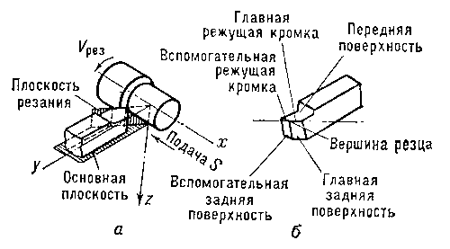 Рис. 1. Схема процесса резания (а) и основные элементы резца (б).