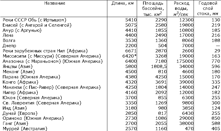 Примечание. Все измерения длины рек и площади их бассейнов производятся по картам. Имеющиеся в этом случае расхождения в цифрах объясняются главным образом следующими причинами: различной точностью измерений, зависящей от применяемой методики и от масштаба используемых карт; различной точностью карт; условностью понятий начальной и конечной точек реки, а также главных рукавов (в случае ветвления); фактическим изменением длины реки, в результате естественного и искусственного спрямления русла (достигает десятков и даже сотен км).