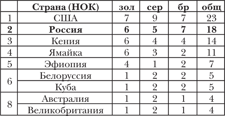 Президент Всероссийской федерации легкой атлетики Валентин Балахничев оценил выступление сборной страны (по пятибалльной системе) на твердую четверку, даже четверку с плюсом. И действительно, сборная России выступила практически так же, как на своей лучшей Олимпиаде в Афинах. Разница составляет только две серебряные медали. Зато по количеству очков (по попаданию в первую восьмерку) в Пекине было лучшее выступление – 200 очков. На 8 больше, чем в Афинах. А американцам россияне уступили только 7 очков. По медалям у нас меньше золотых на одну, а в общем количестве – на две.
