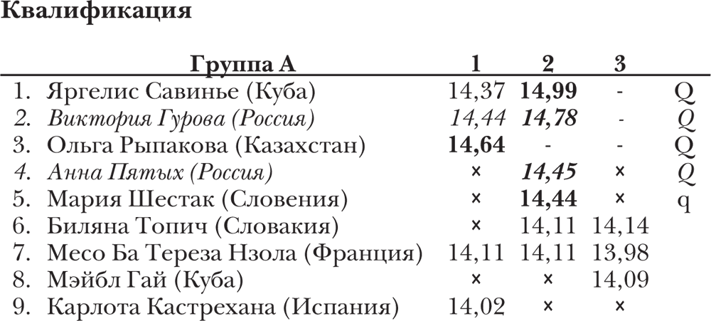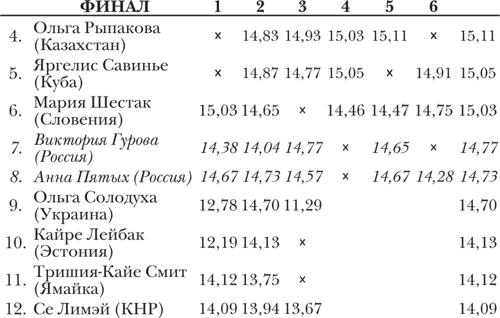 А на четвертое место вышла Ольга Рыпакова из Казахстана, впервые и дважды прыгнув за 15 метров. Она четыре раза устанавливала национальные рекорды: 14,83; 14,93;