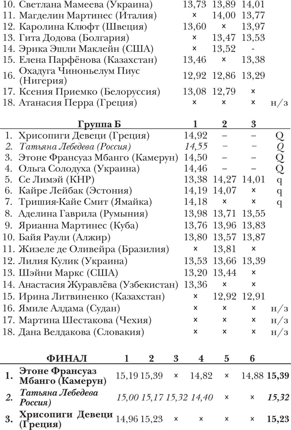 Татьяна Лебедева получила в тройном третью олимпийскую медаль, причем каждый раз улучшала результат. 15, 00 – серебро в 2000 году (Маринова – 15,20), 15,14 – бронза в Афинах после Мбанго (15,30) и Девеци (15,25) и наконец второе серебро – 15,32. Но «золотую» мечту свою пока не осуществила. Может быть, в 2012 году? Татьяна не исключает такой возможности. Ведь разрыв с первым местом все время уменьшается – 20,16 и 9 см. В четвертый раз должно же повезти.