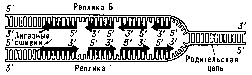 Р. ДНК — многоэтапный генетически контролируемый процесс, в котором участвуют ферменты ДНК-полимераза, ДНК-лигаза, ДНК-метилаза и др. Р. двухцепочечной ДНК имеет фиксированные начало и конец, ориентированное направление. Прерывистый синтез новых цепей начинается в том месте, где расплетаются комплементарные цепи родительской ДНК (см. рис.). В начале каждого из синтезированных отрезков цепей ДНК находится «затравочная» цепочка РНК из 50—100 нуклеотидов. С участием ДНК-полимеразы на РНК наращиваются фрагменты цепей ДНК (в каждом около 1000 нуклеотидов). Затем затравочная РНК уничтожается рибонуклеазой, а синтезированные фрагменты ДНК соединяются в длинные цепи при помощи фермента полинуклеотидлигазы.
