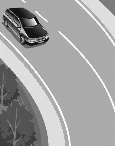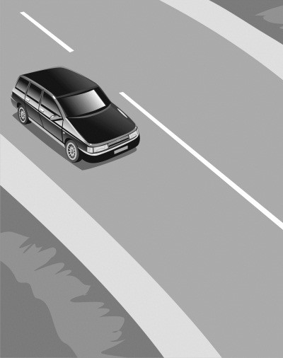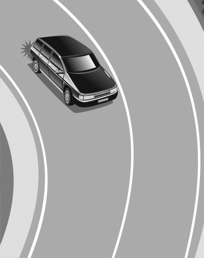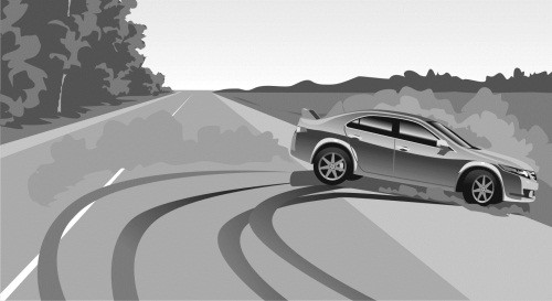 Легковой автомобиль двигался по загородной дороге со скоростью 90 км/ч (илл. 1). Спереди по ходу движения водитель увидел небольшое закругление дороги и решил пройти его без снижения скорости (илл. 2). Однако после поворота руля водитель понял, что вошел в поворот слишком быстро, решил перестраховаться и снял ногу с педали газа, чтобы перенести ее на тормоз (илл. 3). Но затормозить водитель не успел?как только он сбросил газ, машину занесло (илл. 4) и выбросило на встречную обочину (илл. 5).