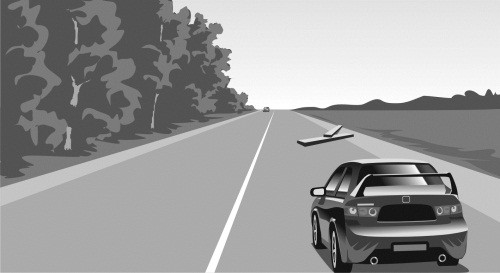 Легковой автомобиль двигался с большой скоростью по загородной дороге. Неожиданно водитель увидел на своем пути толстую доску, которая перекрывала его полосу движения наполовину (илл. 1). Проезд такой доски не предвещал ничего хорошего для колес и подвески машины, поэтому водитель решил объехать препятствие и резко дернул рулем влево (илл. 2). Поскольку по встречной полосе двигался другой автомобиль, то водитель, опасаясь лобового столкновения, так же резко дернул руль вправо (илл. 3). В результате таких действий автомобиль вошел в занос, его развернуло и выбросило на обочину (илл. 4).