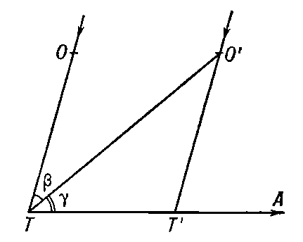 При перемещении наблюдателя вместе с приёмником света, например астрономической трубой, лучу света, падающему на объектив в точке О (рис.), требуется некоторый малый промежуток времени t, чтобы пройти расстояние от объектива О до креста нитей Т, расположенного в фокальной плоскости объектива. За это время инструмент переместится поступательным движением в направлении к точке А (апекс) и займёт положение О' Т', а изображение светила окажется смещенным по отношению к кресту нитей в сторону, обратную движению наблюдателя. Чтобы изображение светила попало на крест нитей, необходимо повернуть трубу в сторону движения наблюдателя на угол ОТО’=b, причём b, выраженное в секундах дуги, определяется формулой