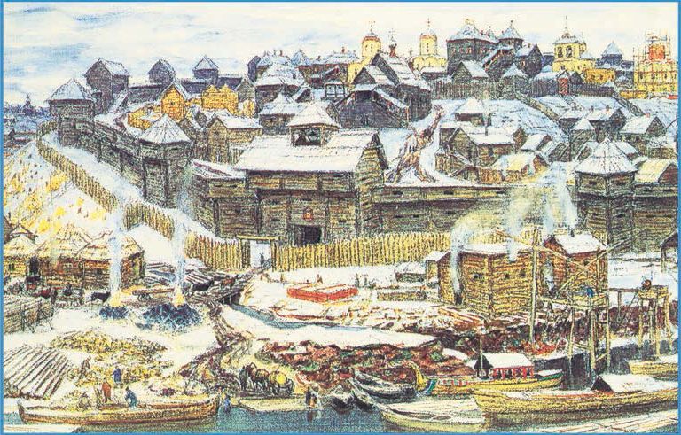 На берегу Москвы-реки, под охраной кремлёвских стен раскинулся торг. У берега устроена пристань. С ранней весны до поздней осени к разным городам идут мимо Москвы ладьи с товарами. Мытники князя Ивана со всех проезжих берут мыт*: с ладьи – два алтына, со струга* – алтын. С купеческих возов тоже берут на заставах мыт: с воза – деньга и с человека тоже деньга. Если же кто из купцов, приплывших водою или пришедших посуху, захочет поторговать на торгу у богатого московского князя и его богатых москвичей, тот платит князю ещё особые пошлины*.