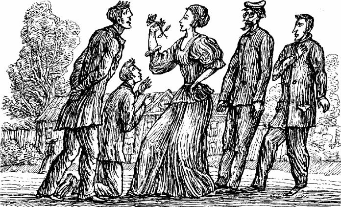 В нескольких шагах от меня – на поляне, между кустами зеленой малины, стояла высокая стройная девушка в полосатом розовом платье и с белым платочком на голове; вокруг нее теснились четыре молодые человека, и она поочередно хлопала их по лбу теми небольшими серыми цветками, которых имени я не знаю, но которые хорошо знакомы детям: эти цветки образуют небольшие мешочки и разрываются с треском, когда хлопнешь ими по чему-нибудь твердому. <…>
