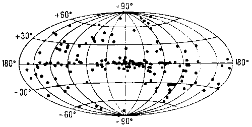 Дискретные источники рентгеновского космического излучения были случайно открыты в 1962 при поиске рентгеновского флуоресцентного излучения Луны под действием космических лучей. К 1975 зарегистрировано более 150 источников. Большая их часть концентрируется к плоскости Галактики, что свидетельствует об их немногочисленности (по различным оценкам, в Галактике всего 103—104 таких источников) и преимущественном расположении в галактическом диске (рис. 3).