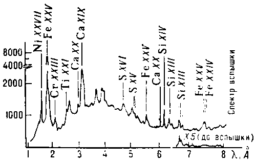 . Наличие на диске Солнца активных областей приводит к появлению жёсткого рентгеновского и даже гамма-излучения (рис. 1). В основном непрерывный спектр имеет тепловой характер с температурой от 106 и до 2×107 К, однако в начале развития вспышки наблюдается и нетепловая компонента. Рентгеновское излучение генерируется в пределах солнечной короны, а также в хромосфере и в переходной, чрезвычайно узкой по высоте области солнечной атмосферы. Обнаружено также и гамма-излучение вспышек, включая линейчатое. В рентгеновском спектре присутствуют линии многократно ионизованных элементов: Fe, Ni, Mn, Ar, Co и др. В основном наблюдаются спектры водородоподобных атомов, имеющих только один оставшийся электрон. С помощью оптики косого падения получены и фотографии солнечного диска в мягкой рентгеновской области спектра (рис. 2). Обнаружена поляризация рентгеновского излучения при вспышках.
