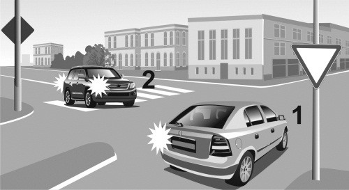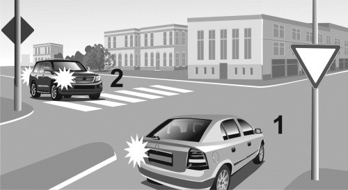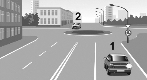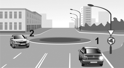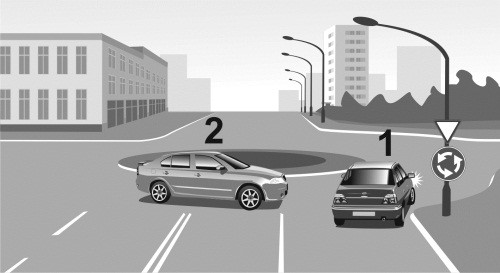 Автомобиль 1 подъезжал к перекрестку с круговым движением, перед которым стоял знак «Уступи дорогу» (илл. 1). По кругу двигался автомобиль 2 (илл. 2). Водитель 1, привыкший к тому, что обычно уступает тот, кто на кругу (принцип помехи справа), въехал на перекресток, не снижая скорости (илл. 3), и совершил столкновение (илл. 4).