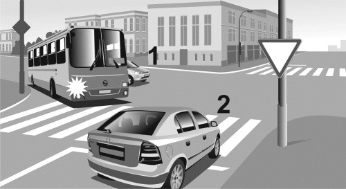 К перекрестку по главной дороге подъезжают автобус (по правому ряду) и легковой автомобиль 1 (по левому ряду) (илл. 1). Одновременно с ними к перекрестку подъехал автомобиль 2 по второстепенной дороге (илл. 2), водитель которого планировал проехать прямо. Увидев, что автобус поворачивает направо, водитель 2 решил, что дорога свободна, и въехал на перекресток, не снижая скорости. Однако неожиданно для него из-за автобуса появился автомобиль 1 (илл. 3), с которым произошло столкновение (илл. 4).