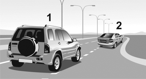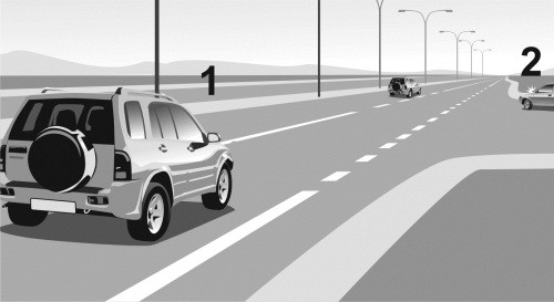 Идеальный въезд на магистраль – выезд в ее правый ряд с развязки или полосы разгона уже со скоростью потока, которая обычно составляет около 110 км/ч. Для того чтобы успеть набрать такую скорость, нужно использовать для ускорения всю длину полосы разгона и – самое главное – весь потенциал двигателя вашей машины. Как и в случае с обгоном по встречной полосе, для интенсивного ускорения необходимо включать повышенную передачу после достижения стрелкой тахометра красной зоны. И педаль газа нажимать до пола на каждой передаче. Вам может показаться, что это насилие над машиной, над мотором. Но если такого «насилия» избежать, то можно попасть в неприятную ситуацию, как водитель 2. Скорее всего он не стал выжимать из машины всю тягу, потому не успел к концу полосы разгона набрать нужную скорость и потому был вынужден влезть под колеса водителю 1.
