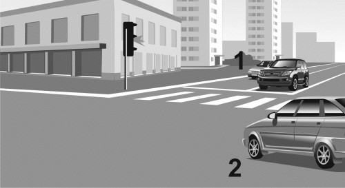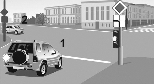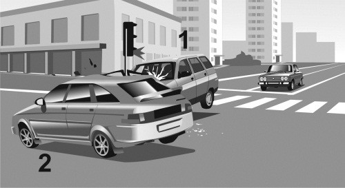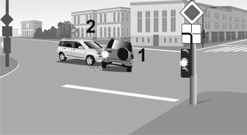 Автомобиль 1 подъезжал по правому ряду к перекрестку, перед которым горел красный свет (илл. 1). В левом ряду у светофора стоял внедорожник, водитель которого ожидал включения зеленого сигнала (илл. 2). В следующий момент красный свет сменился на зеленый, и водитель 1 решил выехать на перекресток, не снижая скорости, и даже прибавил ходу (илл. 3). Но неожиданно на его пути оказался автомобиль 2, который заканчивал проезд через перекресток в перпендикулярном направлении и с которым произошло столкновение (илл. 4).