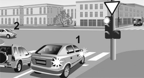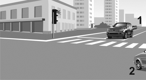 Автомобиль 1 подъезжал к перекрестку в одном ряду за автомобилем 2 на зеленый сигнал светофора (илл. 1). Когда автомобиль 2 подъехал к перекрестку, зеленый сигнал начал мигать, предупреждая о скорой смене сигнала на красный. Водитель 1 в этот момент был уже близко к перекрестку и увеличил скорость, чтобы успеть проехать перекресток, пока не загорелся запрещающий сигнал светофора (илл. 2). Однако водитель автомобиля 2 внезапно решил остановиться и проехать перекресток на следующий зеленый свет, в связи с чем резко затормозил. Водитель 1 не ожидал такого маневра со стороны водителя 2, не успел среагировать и совершил столкновение (илл. 3).