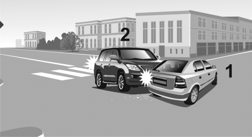 Автомобиль 1 подъехал к перекрестку по главной дороге и планировал повернуть налево (илл. 1, 2). К этому же перекрестку по главной дороге слева приближался автомобиль 2, водитель которого намеревался продолжить движение прямо (илл. 3). Поскольку оба водителя находились на главной дороге, то въехали на перекресток без снижения скорости и столкнулись (илл. 4).