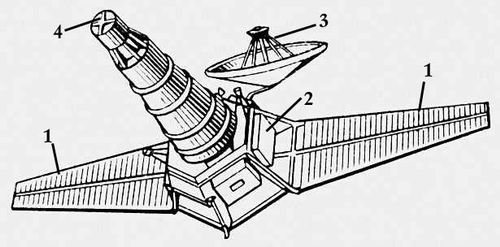 Космический летательный аппарат «Рейнджер»: 1 — солнечные батареи; 2 — контейнер с бортовой аппаратурой; 3 — остронаправленная антенна; 4 — малонаправленная антенна.