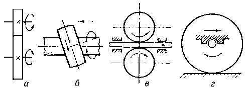 Фрикционные передачи с постоянным передаточным отношением: а — с параллельными осями для передачи вращательного движения; б — для преобразования вращательного движения в винтовое; в и г — для преобразования вращательного движения в поступательное.