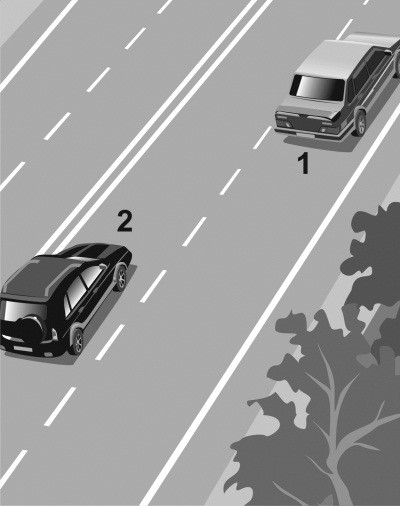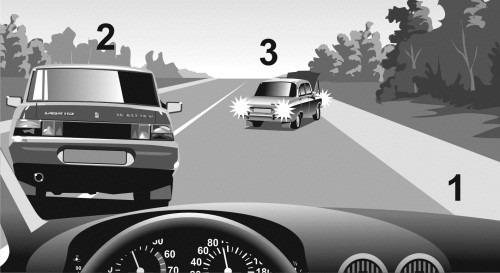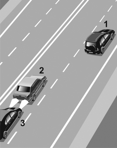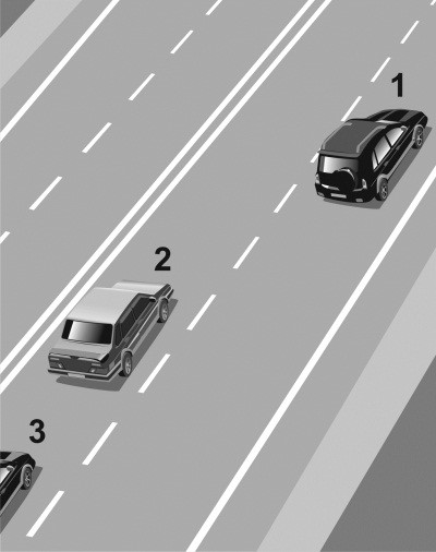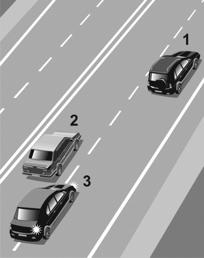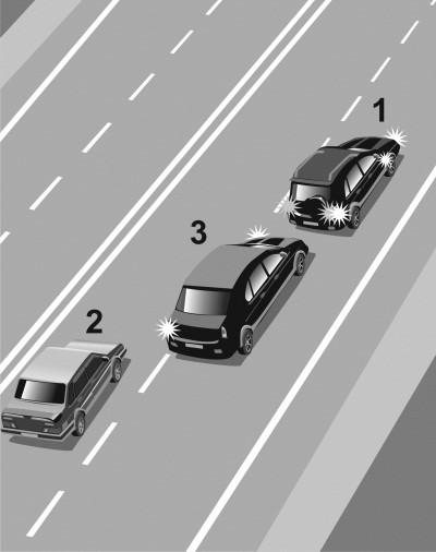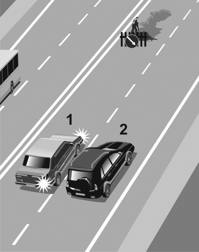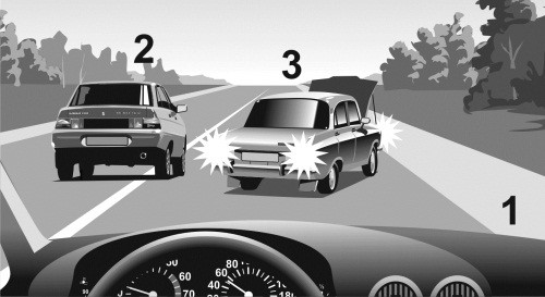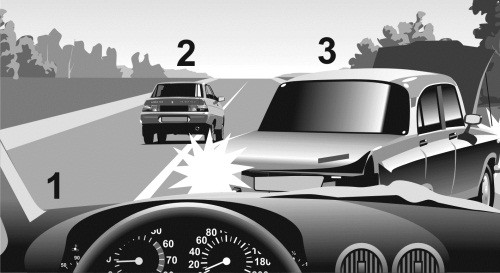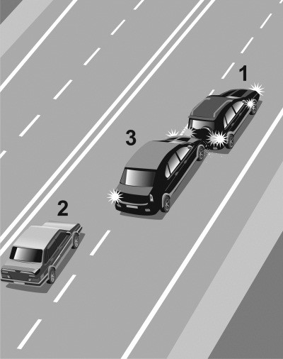 Автомобиль 1 движется с постоянной скоростью по правому ряду загородной дороги с двумя полосами в каждую сторону движения. В левом ряду сзади на небольшой дистанции от него движется автомобиль 2 с той же скоростью (илл. 1). Через некоторое время к автомобилю 2 сзади приблизился автомобиль 3, водитель которого двигался с большей скоростью. Поэтому водитель 3 попросил уступить дорогу водителя 2, «моргнув» дальним светом (илл. 2). Водитель 2 проигнорировал просьбу водителя 3 и продолжил движение в левом ряду с той же скоростью и на той же дистанции относительно автомобиля 1. Тогда водитель 3 решился на обгон автомобиля 2 (илл. 3), хотя такой маневр небезопасен из-за малой дистанции между машинами 1 и 2. В тот момент когда автомобиль 3 перестроился в правый ряд и приблизился к автомобилю 1 (илл. 4), водитель 1 решил припарковаться и начал тормозить. В результате водитель 3 совершил наезд на автомобиль 1 (илл. 5), так как шансов оттормозиться при такой маленькой дистанции у него не было.