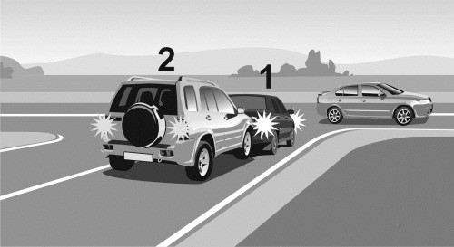 Автомобиль 1 движется по правому ряду дороги с постоянной скоростью. Несколько позади него по соседнему ряду движется автомобиль 2 с той же скоростью (илл. 1). Через некоторое время водитель автомобиля 1 включает левый указатель поворота (илл. 2), смотрит в зеркало заднего вида и, не увидев там автомобиль 2, перестаивается в левый ряд. В результате происходит боковое столкновение с автомобилем 2 (илл. 3).