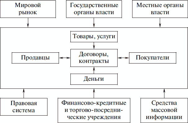 Центр, сердцевина рыночного механизма – отношения между продавцами (производителями, посредниками) и покупателями (потребителями). На эти отношения воздействуют: мировой рынок – международные договоры, мировые цены и т. д.; органы государственной власти – правительственные указы и постановления, вводимые налоги и т. д.; местные органы власти – распоряжения местных властей и вводимые местные налоги; правовая система – законодательство, решения судов, арбитража и т. д.; финансово-кредитные и торгово-посреднические организации – предоставление кредитов, услуг, платежи и т. д.; средства массовой информации – реклама, создание репутации и т. д.