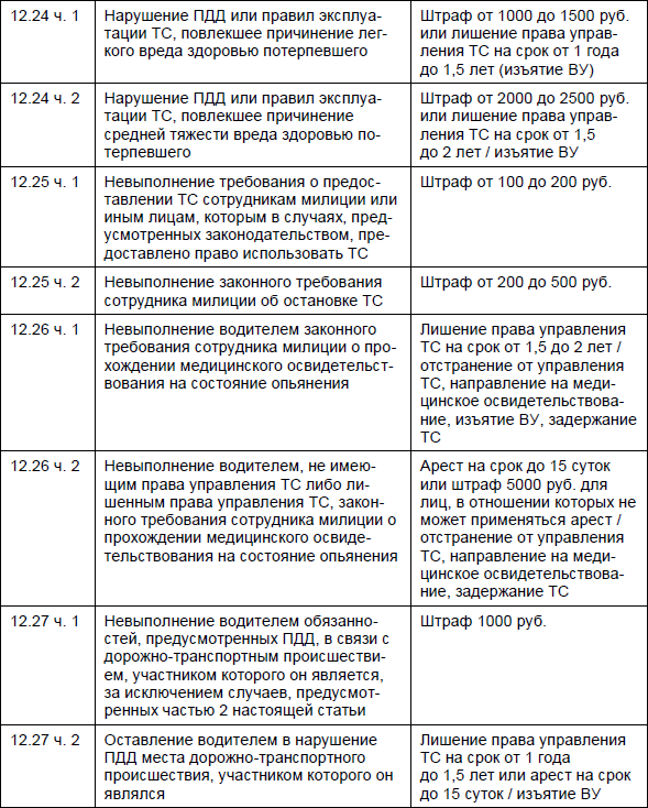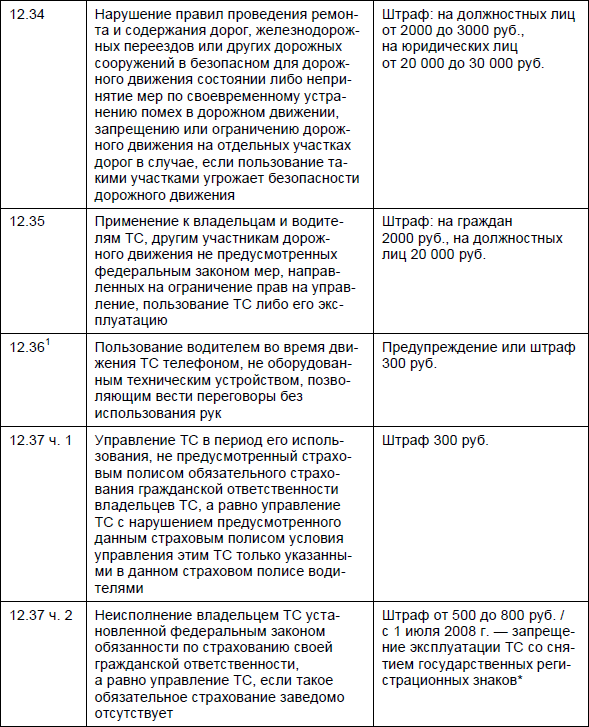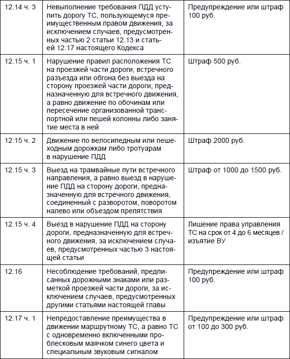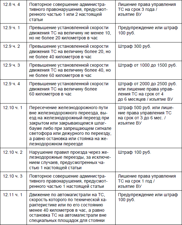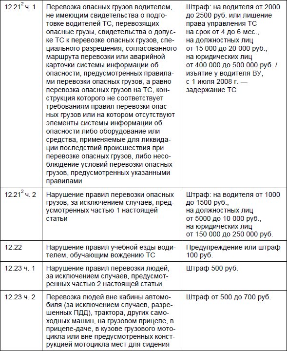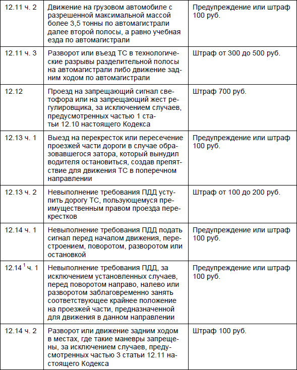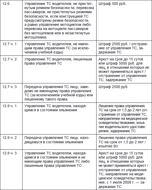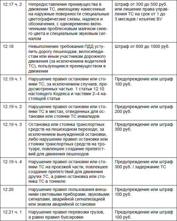 Приложение 8 Административная ответственность за нарушение ПДД (таблица штрафов)