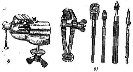 Для удержания деталей при обработке применяют верстачные (фиг. 9, а) и ручные тиски (фиг. 9, б). Губки тисков могут иметь специальные вырезы для лучшего захвата и удержания таких специфических деталей часов, как анкерная вилка, ось баланса, винты и др. Ручные тиски имеют цанговые или конусные зажимы.