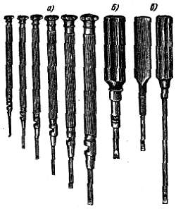 Наиболее распространенными для мелких работ являются отвертки со вставными лезвиями и вращающимися головками, В набор из 6 шт. входят отвертки диаметром 0,6–2 мм (фиг. 8, а). Мелкие отвертки удобно хранить специальных подставках. Со вставными лезвиями могут быть отвертки и другого вида (фиг. 8, б). Для работ с крупными деталями удобны отвертки, изображенные на фиг. 8, в. Рукоятки отверток изготовляют из дерева твердых пород, эбонита или других пластмасс.