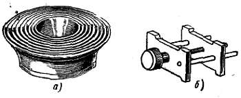 При работе с механизмами наручных и карманных часов применяются деревянные подставки (фиг. 10, а) или металлические (фиг. 10, б) универсальные подставки как для круглых, так и прямоугольных механизмов.
