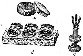 На рабочем месте масло хранится в отдельных масленках для каждого сорта (фиг. 11, а) или их комплектуют по три (фиг. 11, б и в). В крышке последней масленки предусмотрено специальное место для масло дозировок.