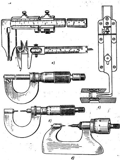 Для измерения применяют мерительные инструменты — линейки, штангенциркули (фиг. 16, а), микрометры переносные универсальные с губками различных диаметров (фиг. 16, б), микрометры настольные (фиг. 16, в), а также приборы для измерения внутренних размеров (фиг. 16, г) — нутромеры.