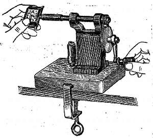 Многосуточные испытания наручных и карманных часов требуют заводки их каждые сутки. Заводка часов при значительном их количестве занимает много времени и является достаточно трудоемкой операцией. Ручная заводка приводит к повреждению пальцев. Поэтому для заводки часов применяют специальные приспособления: плоскую резину или механическое устройство с ручным приводом (фиг. 18).