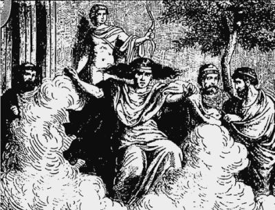 Согласно греческой мифологии, святилище оракула было воздвигнуто на том самом месте, где бог Аполлон умертвил дракона Пифона, никого не допускавшего к расселине, якобы дающей человеку дар пророчества. С тех пор главную жрицу храма стали называть по имени дракона Пифией, а за ней и всех последующих жриц стали именовать также Пифиями. Перед совершением таинства главная жрица совершала омовение и принимала паровую ванну, а затем опускалась в подземную камеру (адитон), стоящую прямо над трещиной. По свидетельству паломников, из нее поднимались потоки воздуха, возможно, увлекавшие за собой вулканические газы. Пифия садилась на треножник, в одной руке она держала ветку лавра (лавр – священное дерево Аполлона), а в другой – чашу с водой из протекающего здесь бурлящего ручья. Под воздействием поднимающихся паров Пифия впадала в транс и начинала бессвязную речь. В обязанности других жриц входило превращение этой речи в более или менее осмысленный текст, который потом подвергался толкованию.