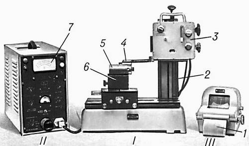 П. состоят из 3 блоков (рис. ): станина с измерительным столиком и приводом (I), электронный блок (II) и записывающее устройство (III). Алмазная игла с радиусом закругления 2—12 мкм располагается в датчике П. Статическое давление иглы на измеряемую поверхность 1—20 мн (1 мн = 0,1 гс ), а в динамических условиях — в пределах 0,06—1,2 мн на 1 мкм осевого перемещения иглы. Запись профиля в приборах с электрическим преобразованием сигнала чаще всего выполняется на металлизированной бумаге. Для удобства расшифровки профилограмма вычерчивается в увеличенном масштабе. Увеличение записи измеряемых высот неровностей в вертикальном направлении возможно в диапазоне от 400 до 200 000 раз. Горизонтальное увеличение осуществляется благодаря более быстрому перемещению бумаги по сравнению со скоростью перемещения иглы (до 100 000 раз). Погрешность вертикального увеличения П. для разных видов приборов от ± 5 до ± 10%, а горизонтального — не более ± 10%. П. обычно изготавливают объединённым с профилометром , снабжают разнообразной оснасткой, обеспечивающей запись профиля деталей различной конфигурации.