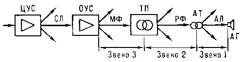 Рис. 1. Структурная схема узла проводного вещания крупного города: ЦУС — центральная усилительная станция; ОУС — опорная усилительная станция (ОУС расположены в разных районах города; на них установлены мощные усилители звуковых частот, питающие распределительную сеть); ТП — понижающая трансформаторная подстанция; АТ — понижающий абонентский трансформатор; АГ — абонентский громкоговоритель; СЛ — соединительная линия; МФ — магистральная фидерная линия; РФ — распределительная фидерная линия; АЛ — абонентская линия.