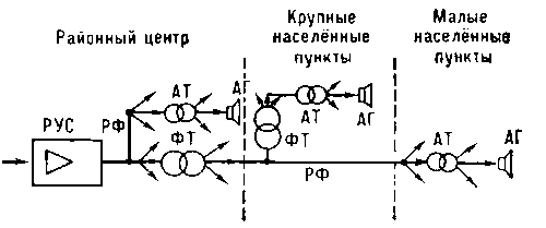 Рис. 2. Структурная схема районного (сельского) узла проводного вещания: РУС — усилительная станция районного узла; ФТ — понижающий фидерный трансформатор; РФ — распределительная фидерная линия; АТ — понижающий абонентский трансформатор; АГ — абонентский громкоговоритель.