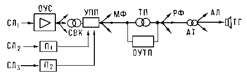 Рис. 3. Структурная схема узла трехпрограммного проводного вещания: П1 и П2 — передатчики; СВК — статив (стойка) выходной коммутации с повышающим трансформатором; УПП — устройство для подключения передатчиков; ОУТП — обходное устройство трансформаторной подстанции для пропуска сигналов дополнительных программ; ТГ — трехпрограммный громкоговоритель. Остальные обозначения те же, что и на рис. 1.