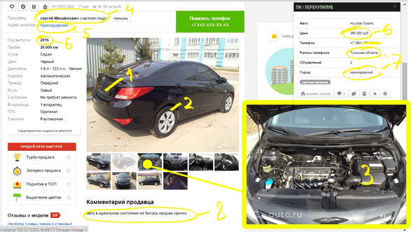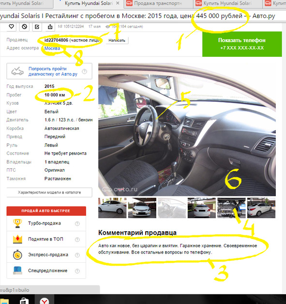 1 – Цена занижена как минимум на 170 000 рублей. 2 – Пробег подозрительно мал, хотя в теории такое бывает. 3 – Типичный комментарий ленивого перекупщика – только общие фразы. 4 – Двигатель помыт. 5 – Руль в чехле. 6 – Салон явно готовили к продаже, нет никаких признаков того, что на машине ездят. В ногах у водителя даже газетка постелена. 7 – Нет имени. Частник всегда его указывает. 8 – Указан просто город. Ни района, ни конкретной улицы.