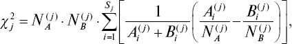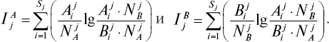 где NA(j) и NB(j)– общее число лиц соответственно в классах «А» и «В», данные которых использовались при построении распределений для j-го признака;Ai(j) и Bi(j) – частоты появления индивидов в i-й градации j-го признака для сравниваемых классов; Sj – число градаций для j-го признака.