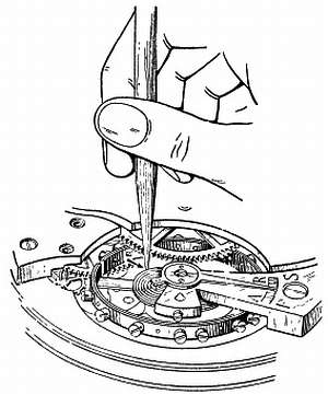 Если механизм часов не намагничен, стрелка компаса останется неподвижной. В то же время вращение стрелки еще не означает, что механизм часов намагничен. Следует проверить ориентацию стрелки компаса на север; снять компас с часов и установить в новом положении. Если стрелка снова будет показывать неправильное направление, то возможно, что и заводная пружина часов намагничена и создает притяжение, влияющее на ход часов. Тогда компас кладут на стол и подносят к нему часы различными сторонами, следя за движениями стрелки. Если механизм намагничен, то он будет отталкивать или притягивать концы стрелки компаса. Если же происходит только притягивание стрелки компаса, то часы не намагничены. Стрелка компаса представляет собой магнит, и ненамагниченный металл будет только притягивать стрелку. Чем тверже металл, тем труднее он намагничивается и более трудно размагничивается. С другой стороны, незакаленная сталь почти не сохраняет намагниченность.