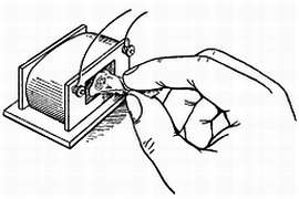 Для размагничивания применяют два типа устройств: в одном используется переменный ток, в другом — постоянный ток. Наибольший интерес для часовщика представляет катушка, в которую помещается деталь для размагничивания. Деталь вводится в катушку и поддерживается так, чтобы она не касалась ее стенок. Ток включается, деталь медленно вынимается из катушки, и когда она будет несколько удалена от катушки, ток выключается (фиг. 422).