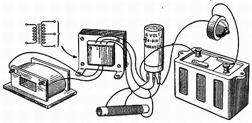 На катушку наматывают медный провод, диаметром примерно 0,5 мм, с двойной хлопчатобумажной изоляцией. Требуется около 126 м провода весом 280 г. Сопротивление обмотки должно соответствовать току 0,5 а при 4,5 в и около 0,675 а при 6 в. Наматывать провод следует равномерно. Около 60 витков пойдет на один слой, а общее количество слоев будет меньше 10. Витки должны быть уложены плотно. Рекомендуется каркас и обмотку пропитать спиртовым лаком (шеллак растворить в метиловом спирте до консистенции молока), покрыть обмотку слоем изоляционной ленты или шелком, который также следует покрыть лаком. Для этой цели вполне пригодны также лаковая эмаль и политура. Концы обмотки прочно закрепляют гайками на болтах. Можно установить катушку на деревянное основание размером 125 мм на 90 мм. На фиг. 424 показано включение катушки.