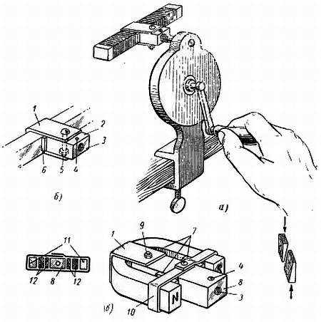 а — ручное точило, снабженное магнитным стержнем; б — стержневой магнит; в — подковообразный магнит; 1 — U-образный медный зажим; 2 — латунный блок; 3 — просверлить и нарезать резьбу для крепления на шпинделе; 4 — потайной винт; 5 — гайку и болт туго затянуть; 6 — заклинить плотно с обеих сторон; 7 — деревянные клинья; 8 — латунный стержень; 9 — гайка; 10 — латунный зажим; 11 — магнит; 12 — клинья.