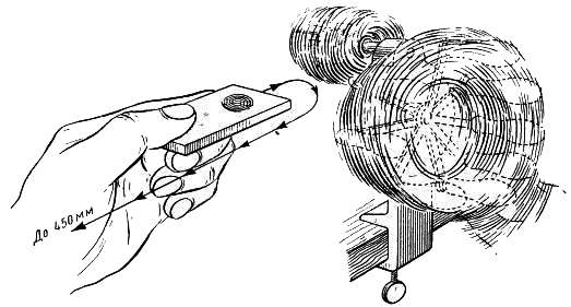 3. Переменное магнитное поле можно получить с помощью быстро вращающегося магнита, когда нет ранее упомянутых устройств. Легче обращаться с магнитным стержнем, но подковообразный магнит может создать более сильное поле. С ручного точила снимают камень и устанавливают зажим, изготовленный из дерева с латунными болтами и гайками. На фиг. 426 и 427 показаны две конструкции зажимов. Магнит должен быть прочно закреплен в зажиме и уравновешен относительно оси вращения. Скорости вращения магнита примерно 1500 об/мин требуются для создания переменного поля с частотой 25 гц (3–5 оборотов ручки в секунду). В некоторых случаях можно использовать ножной привод. Постоянные магниты надо хранить в стороне от рабочего места. Расстояние от основного рабочего места должно быть не менее 2 м.