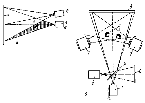 Схемы съемки методом фронтпроекции при оптически несовмещенных (а) и совмещенных (б) объективах проектора и киносъёмочного аппарата: 1 — киносъёмочный аппарат; 2 — проекционный аппарат; 3 — объект переднего плана; 4 — экран; 5 — полупрозрачное зеркало; 6 — светопоглащающая ловушка (сочетание серого фильтра с чёрным бархатом); 7— осветительные приборы.