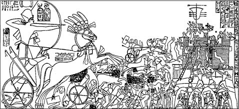 Утро было туманным, и крепость все еще оставалась окутанной легкой дымкой. Незадолго до полудня соединение «Птах» снялось с места и начало переходить реку. Вдруг раздался гром. Рамсес поднял взгляд к небу, но не увидел ни одной тучи. С равнины донеслись крики. Все еще не веривший своим глазам, Рамсес понял настоящую причину страшного шума... Огромная волна хеттских колесниц только что переправилась через реку неподалеку от крепости и врезалась во фланг соединения «Ра»! Другая армада колесниц с неслыханной быстротой атаковала воинов соединения «Птах». За колесницами бежали тысячи пехотинцев, покрывая холмы и долину, как саранча!
