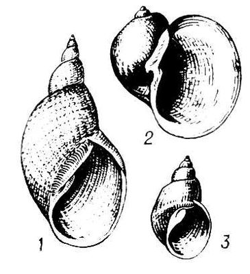 Прудовики: 1 — Lymnaea (Lymnaea) stagnalis; 2 — Lymnaea (Radix) auricularia; 3 — Lymnaea (Galba) truncatula.