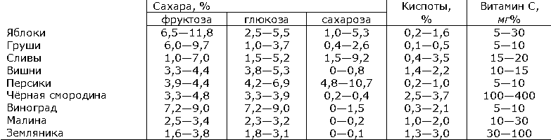 Ф. — один из источников легкоусвояемых углеводов. В Ф. семечковых пород преобладает фруктоза, косточковых — глюкоза и сахароза. Наибольшее количество сахарозы содержится в бананах, ананасах, апельсинах, мандаринах, меньшее — в ягодах. Высоким содержанием крахмала характеризуются бананы. В Ф. много витаминов: аскорбиновой кислоты (витамин С), витамина Р, каротина. В цитрусовых накапливается 50—90 мг% витаминов; особенностью их является сохранение исходного количества витамина без значительных потерь в процессе хранения (в цитрусовых отсутствуют ферменты, окисляющие аскорбиновую кислоту). Значительно количество витамина С в землянике, малине, крыжовнике. Некоторые Ф. представляют собой как бы природные витаминные концентраты: в шиповнике до 1500 мг% витамина С и 5 мг% каротина, в рябине соответственно 50 и 8, в облепихе 120 и 8, в чёрной смородине до 400 мг% витамина С. Калорийность Ф. невелика и составляет в среднем 50—70 ккал в 100 г (1 ккал — 4,19 кдж ). Институтом питания АМН СССР определена ежегодная норма потребления Ф. — 106 кг на человека. По данным ФАО, мировое производство Ф. в 1974 составило (тыс. т ) 213 276, в том числе винограда 63 069; в СССР соответственно 12 441 и 4760.