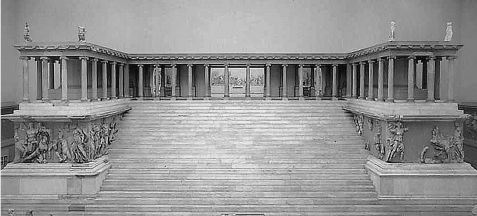 Жители Пергама не поскупились и возвели самый богатый в греческом мире алтарь, посвященный Зевсу. Он представлял собой помост из белоснежного мрамора, квадратный в плане. Вдоль трех стен шла мраморная лента рельефа, а с четвертой лестница вела на окруженную колоннадой площадку. На площадке находился мраморный жертвенник. Рельефный фриз Пергамского алтаря изображает битву богов с гигантами. Ваятели Пергама создали великолепный фриз, который украшал алтарь и воспроизводил схватку богов и восставших против них гигантов. Фигура Зевса превосходит остальные величиной и силой. Вооруженный молнией, верховный бог ведет бой сразу с тремя гигантами. Громовержец сокрушает своих врагов, и они гибнут в страшных мучениях. Алтарь уже в свое время был признан выдающимся произведением искусства.